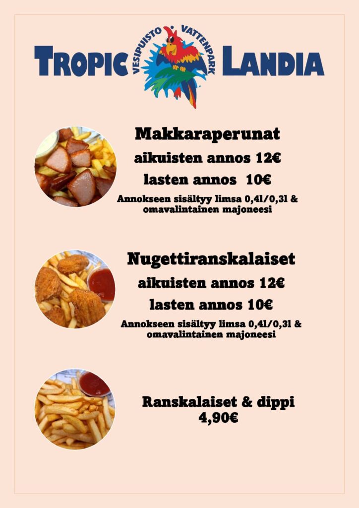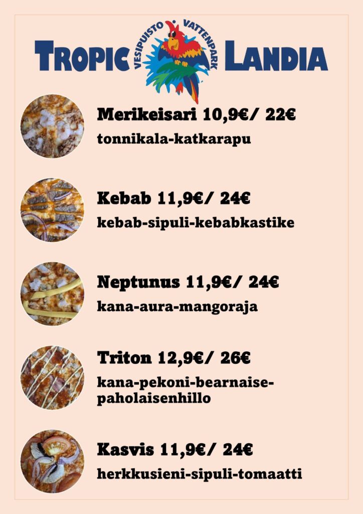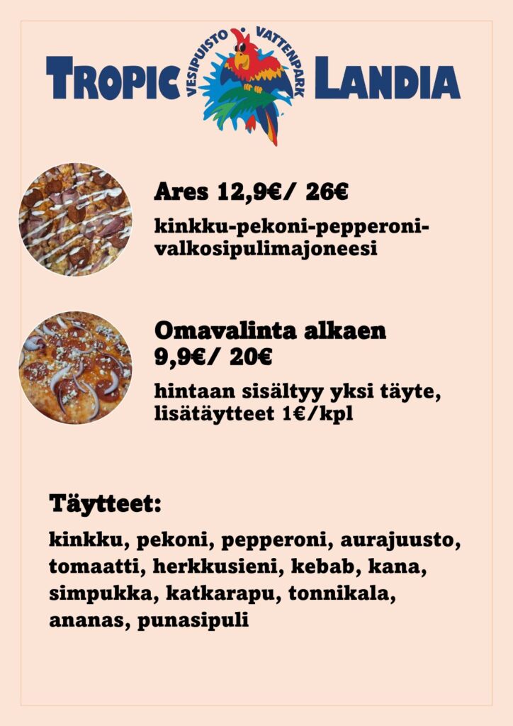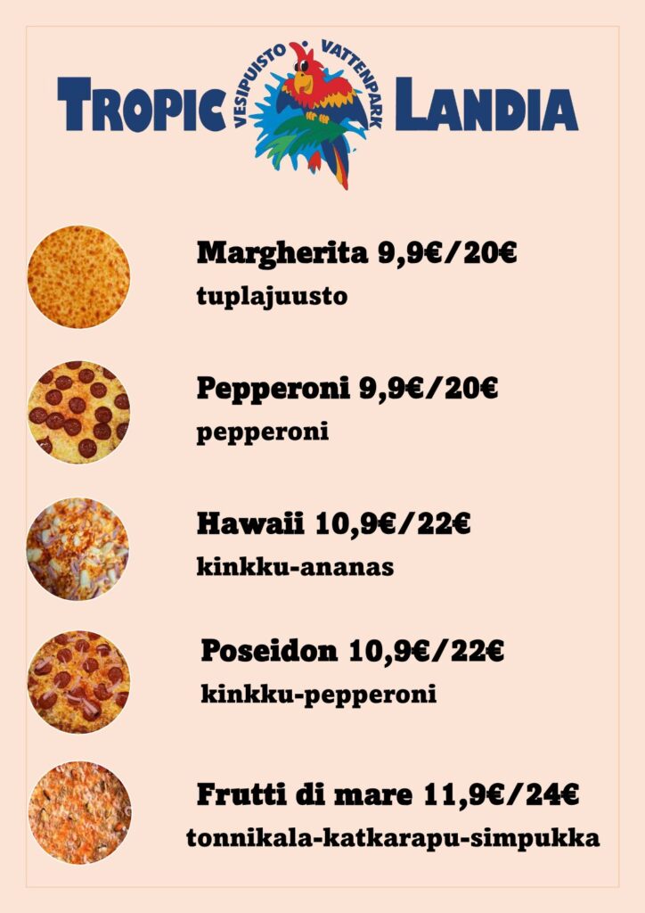 Kylpylän ravintola tarjoaa herkutteluhetken viihtyisässä tunnelmassa. Voit valita annoksen herkullisesta menustamme, josta löytyy erilaisia pizzoja, wrappejä, ranskalaisia eri lisukkeilla ja salaattia.